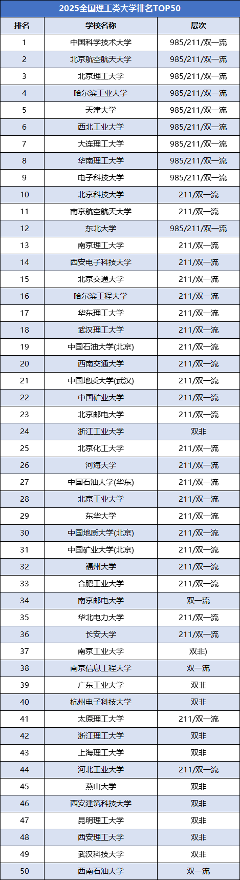理工类院校和专业历来是高考报考的“抢手赛道”,关心度常年居高不下!理工类高校数量浩繁,分歧院校正在劣势学科、培育特色上各有侧沉。小编按照《2025软科中国大学排名》,汇总拾掇了2025年全国理工类大学TOP50排名中,中国科学手艺大学持续六年连任榜首,航空航天大学、理工大学紧随其后,别离位列第二、三名。此中浙江工业大学、南京工业大学、广东工业大学、杭州电子科技大学等11所双非高校表示亮眼,凭仗正在奸细学科范畴的积淀,正在一众名校中占领了一席之地。当然,不少同窗和家长可能会迷惑,为啥大学、华中科技大学、上海交通大学等学校没有进入前10,缘由其实很简单这些学校理工科实力虽然很强,但它们其实是属于分析类大学,天然也就不会纳入到理工类大学的排行榜了。山东大学没有上榜的缘由也是如斯。中国科学手艺大学是“985工程”和“211工程”,A类世界一流大学扶植高校,是一所以前沿科学和高新手艺为从,兼有医学、特色办理和人文学科的分析性全国沉点大学。中国科大是为“两弹一星”事业而开办的一所大学,她的开办被称为“我国教育史和科学史上的一项严沉事务”。7个A+学科,数量居全国高校第五,“数理化六合生”六个根本学科全数被评为A或A+,全国高校独一!26个本科专业获得国度级一流专业扶植点认定。以下是第四轮具体的学科评估成果。中科大2024届本科结业生深制率达82%,深制群体中80%赴世界前100高校,国内升学90%进入“双一流”高校。结业生根本结实、能力凸起、尝试技术全面,深受深制院校取用人单元青睐。就业单元涵盖中科院系统、国防军工集团、双一流高校、国度沉点单元;以及华为、字节跳动等世界500强企业、寒武纪等独角兽企业。该校本科间接就业人数较少,供需持续紧俏。所以,中科大能排进理工类大学的第一名也是实至名归的。别的中国科学手艺大学少年班、少创班将于12月报名,成心向的考生能够沉点关心!北航成立于1952年,是首批16所全国沉点大学之一,是国度“211工程”、“985工程”、“2011打算”沉点扶植高校,2017年成为国度“双一流”扶植A类高校。世界出名的分析性研究型大学,展示出三个显著特点:一是高精尖:学科专业和研究标的目的尖端。二是有贡献:贡献了良多国内第一的科研。三是前景好:将来去向“三高一多”,即就业率高、升学率高、薪酬待遇高、支流行业多。正在第四轮学科评估中,北航有4个A+专业,3个A专业,7个A-专业。以下是具体的学科评估成果。近年来,总体结业去向落实率为95%,2024年,我校本科生结业生全体深制率为77。04%(包含出国、出境深制),国内深制率为69。71%。北航结业生就业既具有明显的行业特色,分布又兼具普遍性。每年有近三分之一结业生正在航空航天范畴就业,近三分之一结业生正在IT消息范畴就业,近三分之一结业生选择公事员、选调生、事业单元、科研设想单元就业,其他结业生普遍分布于金融、电力、交通、新能源等诸多行业范畴。理工大学(Beijing Institute of Technology,缩写为BIT),简称为北理工,位于市,附属于工业和消息化部,是国度历批次沉点扶植大学、地方曲管高校,位各国家首批“211工程”、“985工程”、“双一流”扶植高校。正在第四轮学科评估中,北理有1个A+专业,6个A-专业。以下是具体的学科评估成果。2024年本科结业生深制率超72%,此中国内深制,约占全数本科生的63%;出国(境)深制,约占全数本科生的9%。本科生平均就业率95%,研究生就业率近100%,结业生就业合作力居全国前列,到国度沉点扶植行业、沉点部分、沉点单元和世界500强企业就业的结业生近2/3。工业大学(Harbin Institute of Technology),简称哈工大,学校有、威海、深圳三个校区,校本部位于省市。位各国家“双一流”、“985工程”、“211工程”。哈工大是国内顶尖高校联盟“C9联盟”之一,同时也是“国防七子”之一,开办于1920年,其前身是工业学校。正在教育部第四轮学科评估中,哈工大共有17个学科位列A类,学科优良率(A类学科占授权学科的比例)位列全国第六位,A类学科数量位列全国第八位,工科A类数量位列全国第二位。哈工大结业生结业去向落实率持续提拔2024年达99。29%。到沉点单元、沉点范畴和世界500强企业就业占比持续10年连结正在80%以上。2023届、2024届结业去向落实率居C9高校首位,两年累计向全国31个省(区、市)输送817名选调生。(天大,Tianjin University),坐落于天津市,做为教育部曲属的“985工程”“211工程”和“双一流”扶植高校,正在师资力量、科研平台、人才培育等方面均处于国内高校前列。学校具有13位院士、68位国度“精采青年科学基金”获得者等优良师资步队,科研丰盛,承担了大量国度级科研项目。正在第四轮学科评估中,天大有14个A类学科,此中1个A+、4个A、9个A-。比力可惜的是A+学科里面没有新工科,可是A和A-学科里面有光工、仪器、软工等,保守工科好比化工、机械、土木、热动、水利等都是A类学科,所以天大的全体工科实力很强,是当之无愧的北方工科之王!2024届本科结业生共4547人,结业去向落实率89。48%。此中,国内升学2499人,占55。21%,含保研1569人,占比34。67%;出国(境)深制336人(占比7。42%),83。63%进入帝国理工学院、哈佛大学、剑桥大学等QS前100高校;2024届本科结业生中,以各类形式间接就业的共有1215人,占本科结业生人数的26。84%。次要就业单