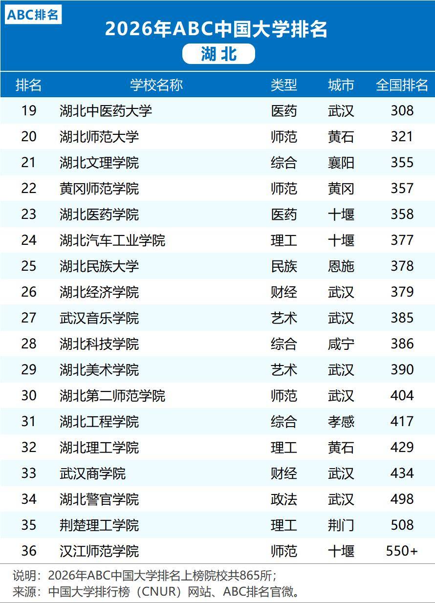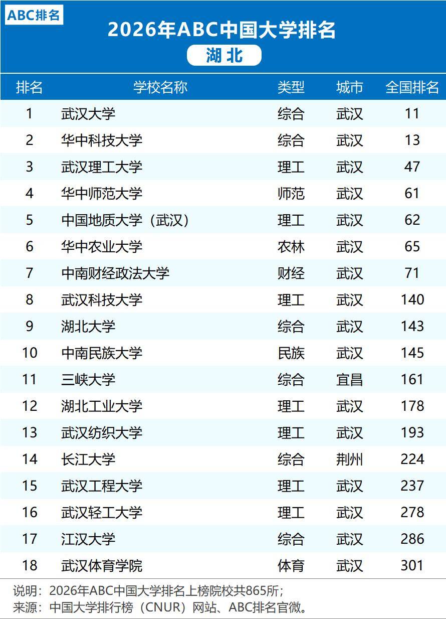 2026年ABC中国大学排行榜揭晓,湖北高档教育呈现繁荣气象。武汉大学取华中科技大学稳居全国前列,引领。武汉理工大学、华中师范大学、中国地质大学(武汉)、华中农业大学及中南财经大学均跻身全国百强,彰显杰出实力。武汉科技大学、湖北大学、中南平易近族大学、三峡大学等校持续,配合形成了湖北多条理、多类型的高档教育生态系统。此中,地大取华中师大的比赛、湖工大的安定地位以及湖科院的前进尤为值得关心。