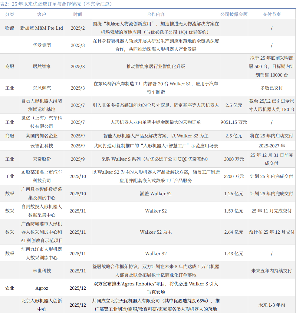 具身人形加快成长期(2023年至今):2023年12月29日公司港交所从板上市,次年发布了工业级人形机械人Walker S1,并进入比亚迪、吉利极氪5G工场、一汽公共等多家车厂实训。2025年,公司发布工业双脚人形Walker S2、轮式人形Cruzr S2、商用脚式人形Walker C,结合发布科研教育人形天工行者。本年以来公司计谋沉心转向人形机械人规模化落地,至25岁暮累计正在手订单跨越13亿元,合做伙伴包罗奥迪一汽、比亚迪、吉利汽车、富士康、顺丰速运、一汽-公共、北汽新能源、春风柳汽、天奇股份、人形机械人立异核心等。
