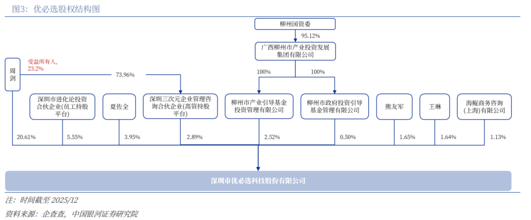 创始人周剑为公司现实受益人。目前,创始人周剑(受益所有人,间接+间接管益股份23。2%)、比亚迪联创&优必选非施行董事夏佐全(3。95%)、深圳投资合股企业(5。55%)、深圳三次元企业办理征询合股企业(2。89%)、柳州产投旗下两只基金(3。02%)、副总司理&首席手艺官熊友军(1。65%)、总裁帮理(1。64%)合计持股39%。此中深圳三次元为高管持股平台,创始人周剑占股73。96%。