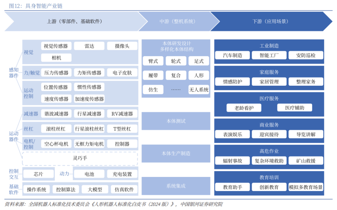 具身智能财产链涵盖多个环节,上逛包罗零部件和根本软件,中逛包罗零件系统研发设想、本体测试、出产制制、系统集成,下逛笼盖科研教育、贸易办事、工业制制、高危功课、医疗康养、家庭办事等使用场景。此中上逛零部件能够划分成器件(如视觉、力/力矩、触觉及其他传感器等),活动器件(如电机/节制、减速器、丝杠等),节制交互(如芯片、动力系统等);根本软件包罗操做系统、节制算法、大模子和仿实软件等。中逛具身智能机械人具有多样化的本体布局,包罗臂式/轮式/脚式/履带/复合/人形/仿生及其他无人系统等,此中人形以其更高拟人道、更强交互性和对的适配性,成为最具关心度的形态。