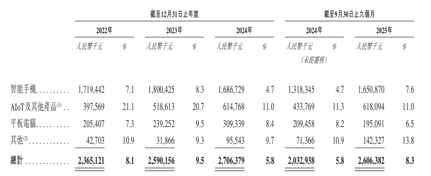 此中,智妙手机是公司次要的收入来历,相关收入别离为242。7亿元、218。2亿元、36元以及217亿元,别离占同期总收入的82。7%、80。3%、77。9%和69。3%。AIoT及其他产物增速更较着,2022年~2024年以及本年前三季度,别离为公司贡献了6。5%、9。2%、12%、17。9%的收入,占比逐渐扩大。